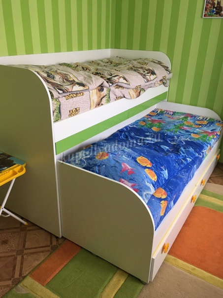 Кровать двухъярусная с выкатными столиками для творчества, служащая надстройкой над КР-01 для экономии пространства в комнате.