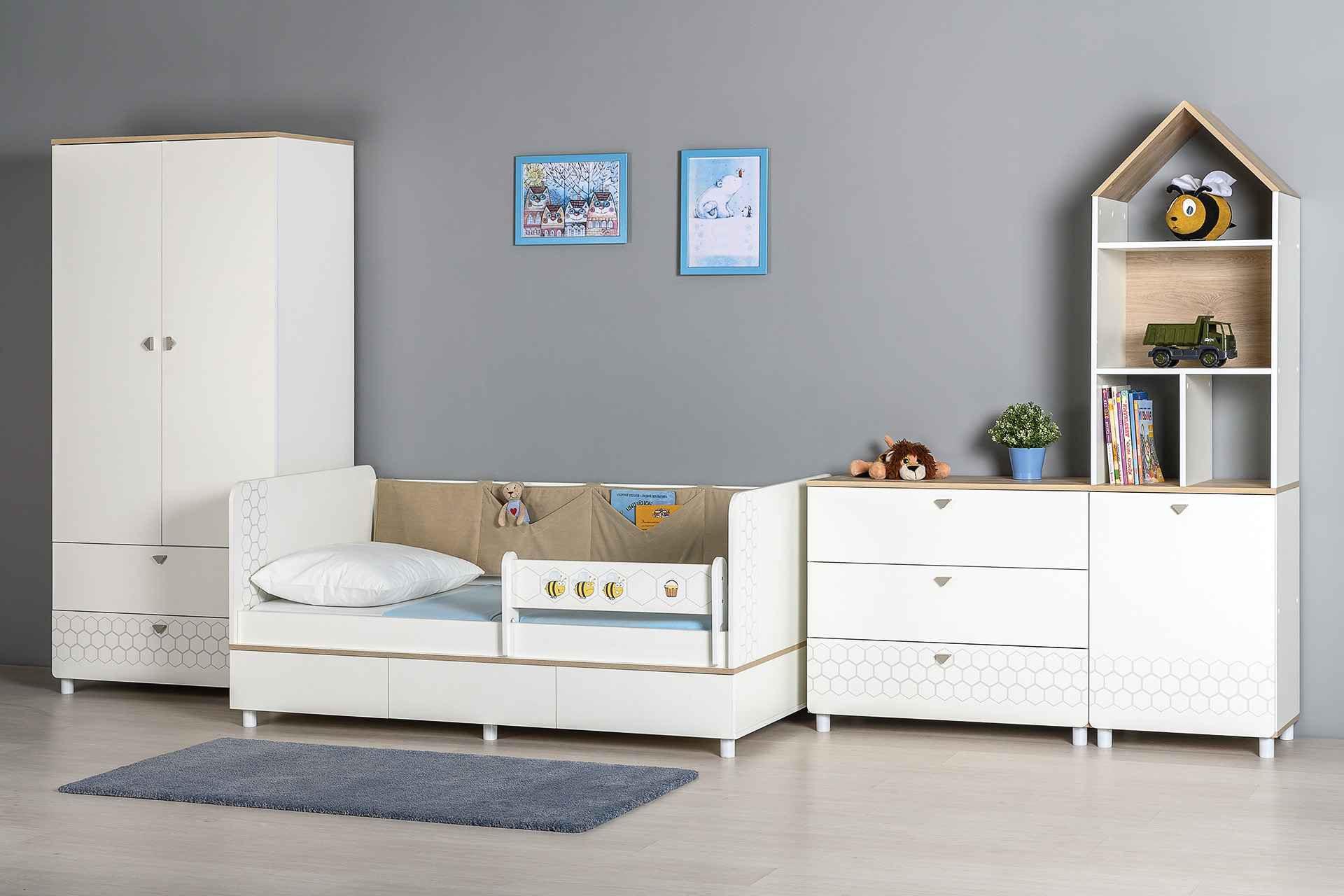 Кровать оснащена съёмным мягким элементом с карманами, передвижным бортиком и декорирована оригинальным рисунком - мультяшными пчёлками, которые никого не оставят равнодушным.