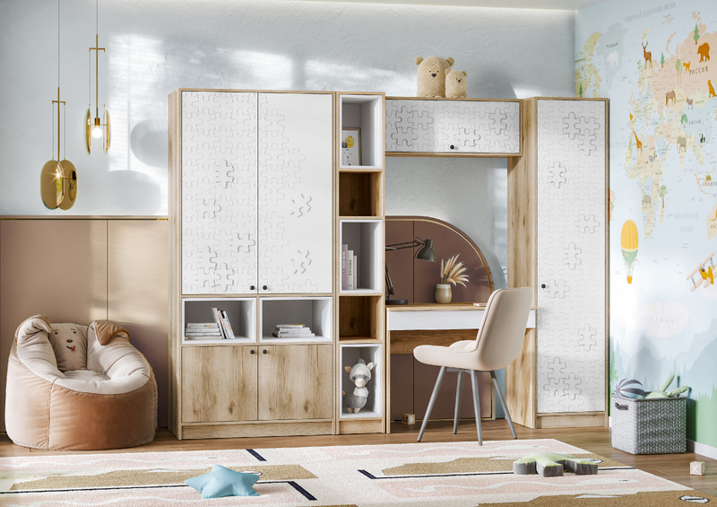 Модульная детская Киви состоит из нескольких модулей, которые обеспечат удобство и функциональность для детской комнаты. Этот комплект поможет создать уютное и функциональное пространство для ребенка, где он сможет играть, учиться и отдыхать с комфортом.