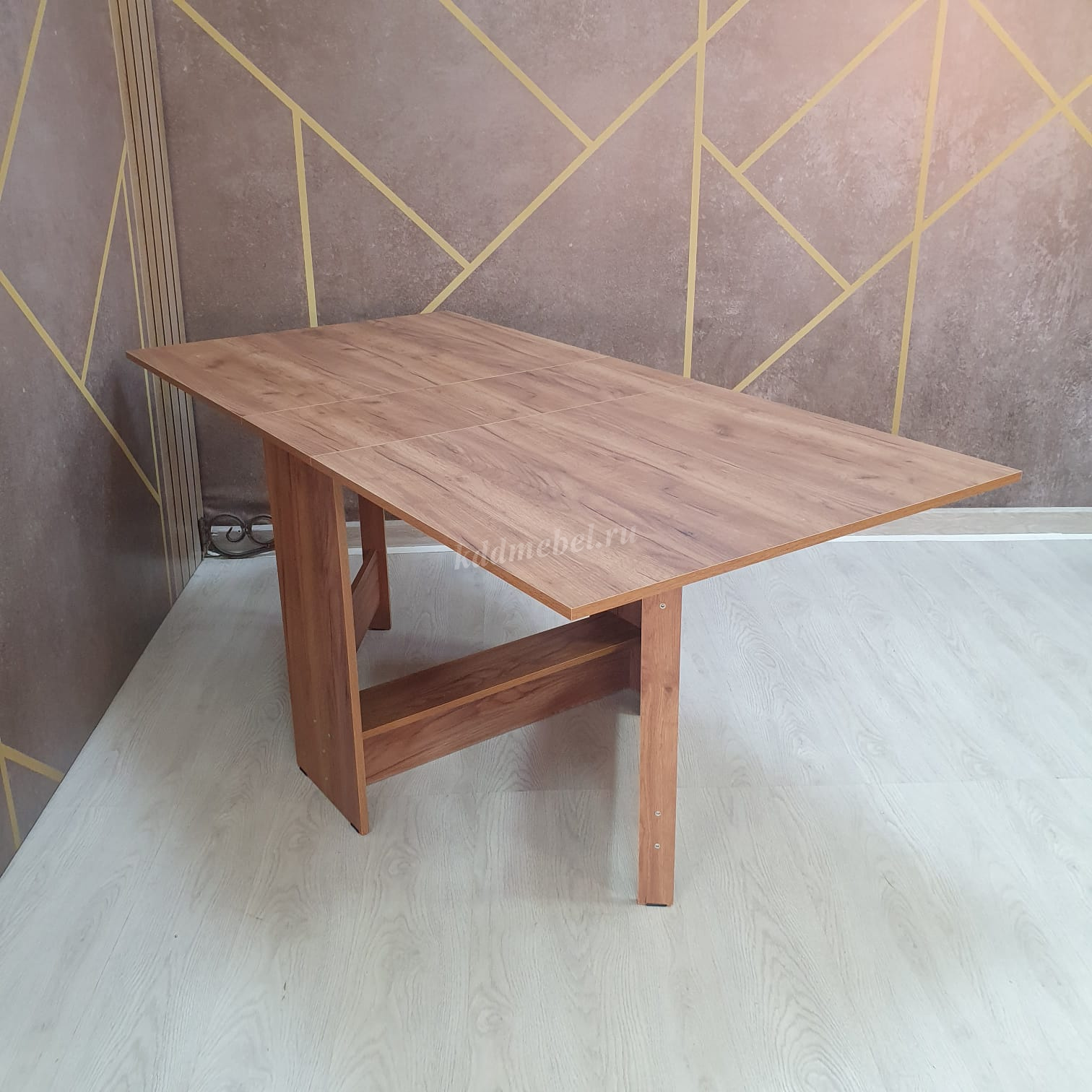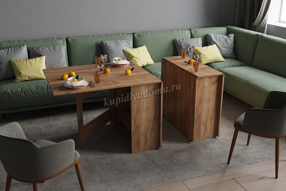 Стол имеет 3 положения: полностью сложенный, разложенный наполовину или полностью разложенный.