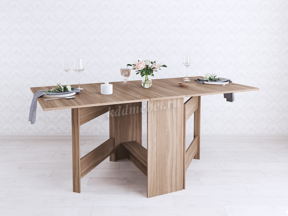 Стол имеет 3 положения: полностью сложенный, разложенный наполовину или полностью разложенный.