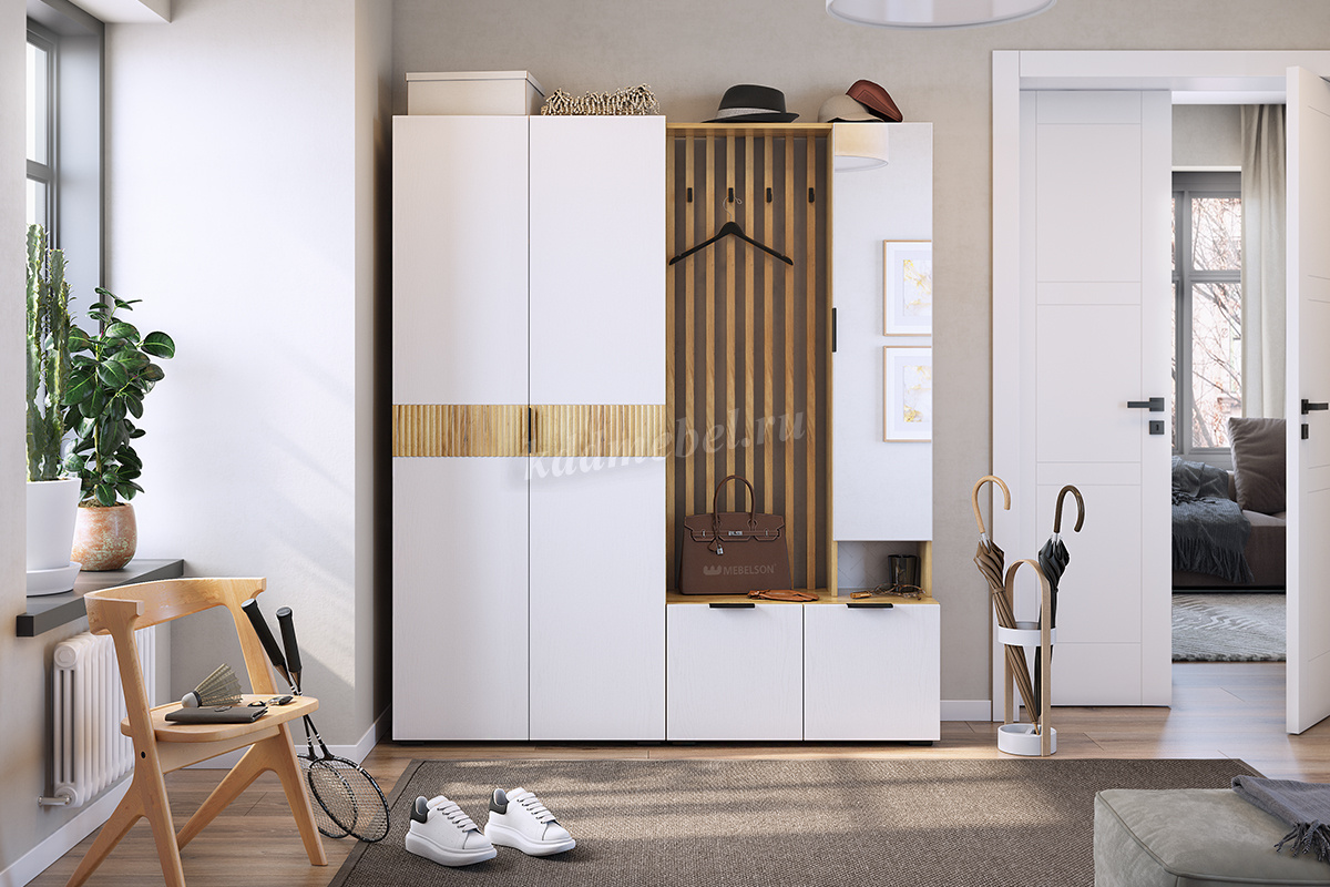 Стильные, трендовые рейки МДФ, акцентные крючки, зеркало, в котором можно себя увидеть в полный рост, полки для мелочей и головных уборов,
