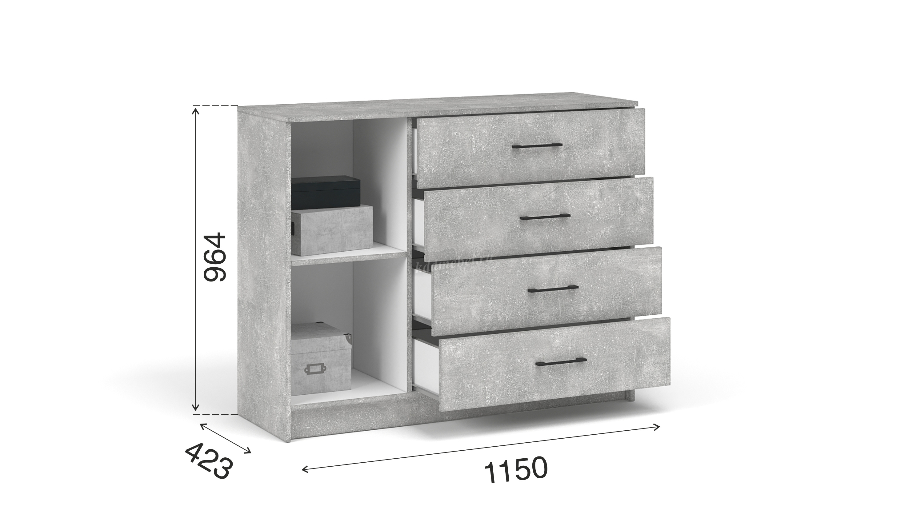 Практичный и надежный комод, изготовленный из прочного ЛДСП высокого качества, оборудован вместительными полками и выдвижными ящиками на роликовых направляющих для удобного хранения вещей по категориям. Нейтральные цвета декора визуально добавляют света и создают уют, а черные матовые ручки завершают композицию. Комод легко вписывается в готовые интерьеры благодаря своему универсальному дизайну и гармонично сочетается со всеми элементами модульной системы Чикаго