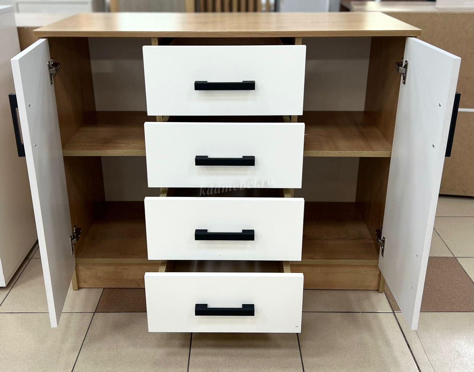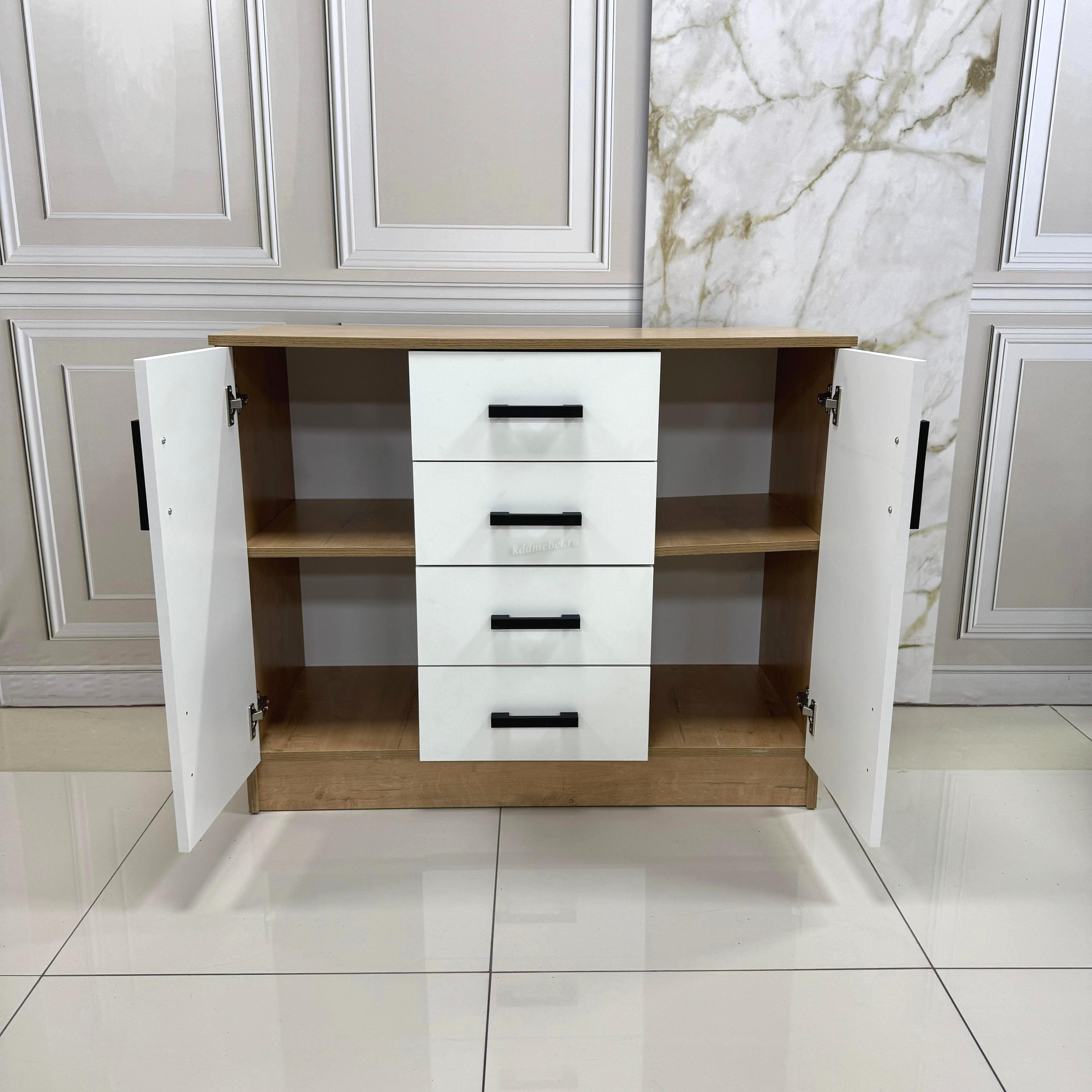 Имеет четыре выдвижных ящика и вместительные ниши за распашными дверцами.