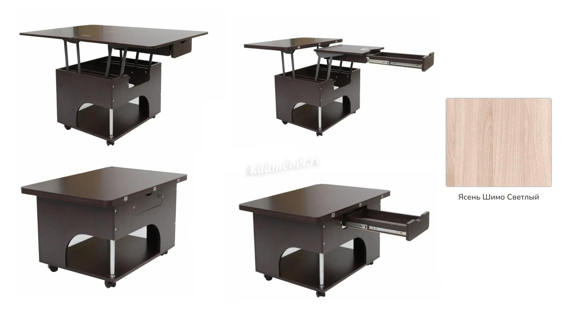 Журнальный стол трансформер «Стэп» это умная экономия пространства. Простой в использовании механизм трансформации позволит Вам увеличить поверхность стола в два раза по площади и высоте и превратить журнальный стол в обеденный за считанные секунды.